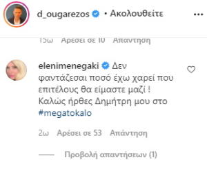 Φυσικά, η Ελένη Μενεγάκη μόνο χαρούμενη θα μπορούσε να είναι και σήμερα το πρωί σχολίασε κάτω από την ανάρτηση του Δημήτρη Ουγγαρέζου: «Δεν φαντάζεσαι ποσό έχω χαρεί που επιτέλους θα είμαστε μαζί! Καλώς ήρθες Δημήτρη μου στο #megatokalo».