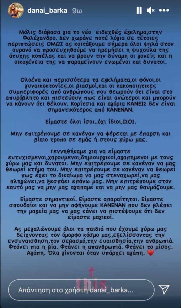 «Μόλις διάβασα για το νέο ειδεχθές έγκλημα, στην Φολέγανδρο. Δεν χωράνε ποτέ λόγια σε τέτοιες περιπτώσεις, όμως ας κοιτάξουμε σήμερα όλοι ψηλά στον ουρανό να προσευχηθούμε να ηρεμήσει η ψυχούλα της άτυχης κοπέλας και να βρουν την δύναμη οι γονείς και η οικογένειά της να παραμείνουν ενωμένοι και δυνατοί», αναφέρει η Δανάη Μπάρκα συμπληρώνοντας. : «Ολοένα και περισσότερα τα εγκλήματα, οι φόνοι, οι γυναικοκτονίες, οι βιασμοί και οι κακοποιητικές συμπεριφορές από ανθρώπους, που θεωρούν ότι είναι στο απυρόβλητο και πιστεύουν πως είναι ανώτεροι και μπορούν να κάνουν ό,τι θέλουν. Κορίτσια και αγόρια ΚΑΝΕΙΣ δεν είναι σημαντικότερος από ΚΑΝΕΝΑΝ. Είμαστε όλοι ίσοι…όχι ίδιοι, ΙΣΟΙ. Μην επιτρέπουμε σε κανέναν να φέρεται με έπαρση και βίαιο τρόπο σε εμάς ή στους γύρω μας».
