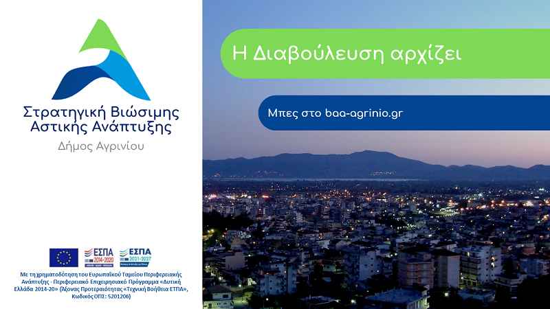 Στο πλαίσιο της συνδιαμόρφωσηςγια τη νέα Στρατηγική Βιώσιμης Αστικής Ανάπτυξης για την προγραμματική περίοδο 2021–2027, ο Δήμος Αγρινίου προσκαλεί όλους τους ενδιαφερόμενους πολίτες, επιχειρήσεις και φορείς να συμμετέχουνμε την υποβολή προτάσεων και παρατηρήσεων.