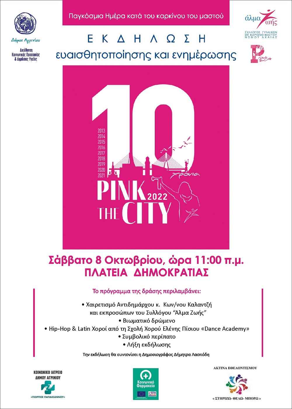 Ο Δήμος Αγρινίου προσφέρει δωρεάν το ροζ T-Shirt «Pink the City» στους πρώτους 150, οι οποίοι θα εγγραφούν για την συμμετοχή τους στο συμβολικό περίπατο που θα ξεκινήσει και θα καταλήξει στην Πλατεία Δημοκρατίας, μέσω των οδών Μπαϊμπά, Κύπρου, Πλατεία Ειρήνης, Παπαστράτου.
