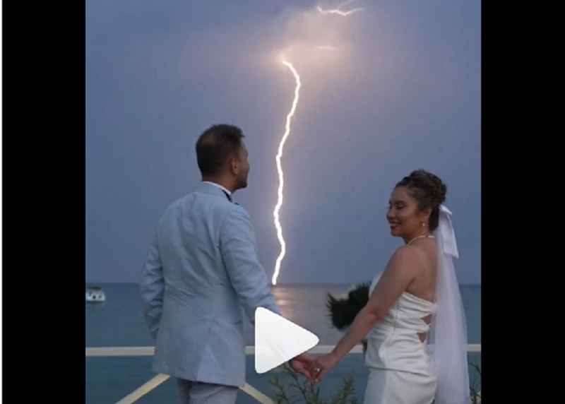 Τότε ο ουρανός φωτίζεται και ένας εντυπωσιακός κεραυνός πέφτει πίσω τους στη θάλασσα. Φυσικά το ζευγάρι δεν πτοήθηκε… Αντίθετα η εξέλιξη αυτή καθόλου δεν τρόμαξε το ζευγάρι των νεόνυμφων που βρήκε το πλάνο υπέροχο.