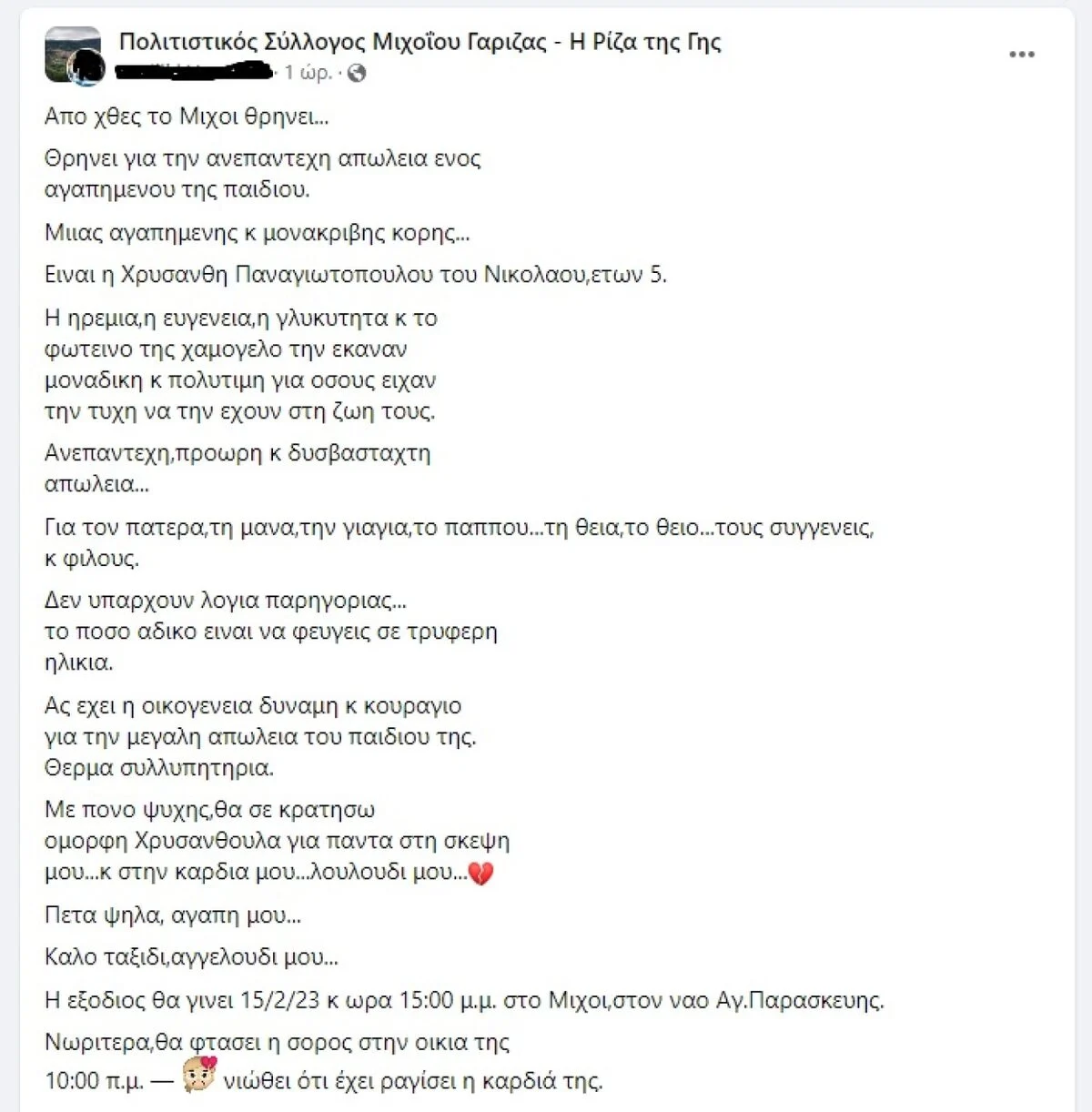 Την τραγική είδηση του θανάτου της 5χρονης έκανε γνωστή στα social media, ο Πολιτιστικός Σύλλογος Μιχοΐου Γαριζας – Η Ρίζα της Γης: