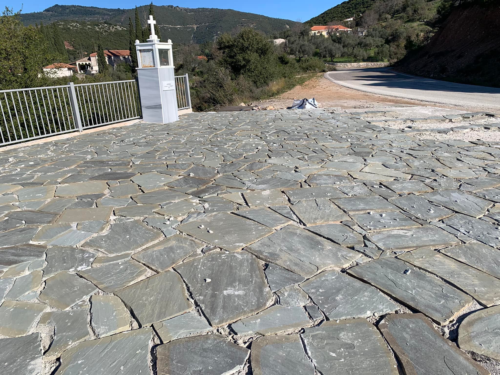 Μετά την διαμόρφωση χώρου ,τα στηθαία και τα κάγκελα που έχουν τοποθετηθεί στη νέα πλατεία στο Μέγα Δένδρο στην θέση “ΚΑΓΚΕΛΗ” οι εργασίες πέρασαν στο τελικό στάδιο με την πλακόστρωση του χώρου .