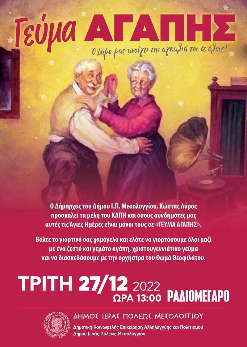 O Δήμος Ι.Π. Μεσολογγίου  πραγματοποιεί  «Γεύμα Αγάπης»   την Τρίτη 27 Δεκεμβρίου 2022 και ώρα 13:00 στο Ραδιομέγαρο  εν όψει των Αγίων Ημερών των Χριστουγέννων.Στο Γεύμα θα συμμετάσχουν μέλη του Κ.Α.Π.Η και συνδημότες μας που ζουν μόνοι.