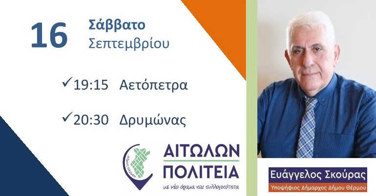 Σήμερα (16/09) ο Συνδυασμός “ΑΙΤΩΛΩΝ ΠΟΛΙΤΕΙΑ ” με επικεφαλής τον Ευάγγελο Σκούρα, Υποψήφιο Δήμαρχο Δήμου Θέρμου, θα επισκεφθεί Αετόπετρα και Δρυμώνα